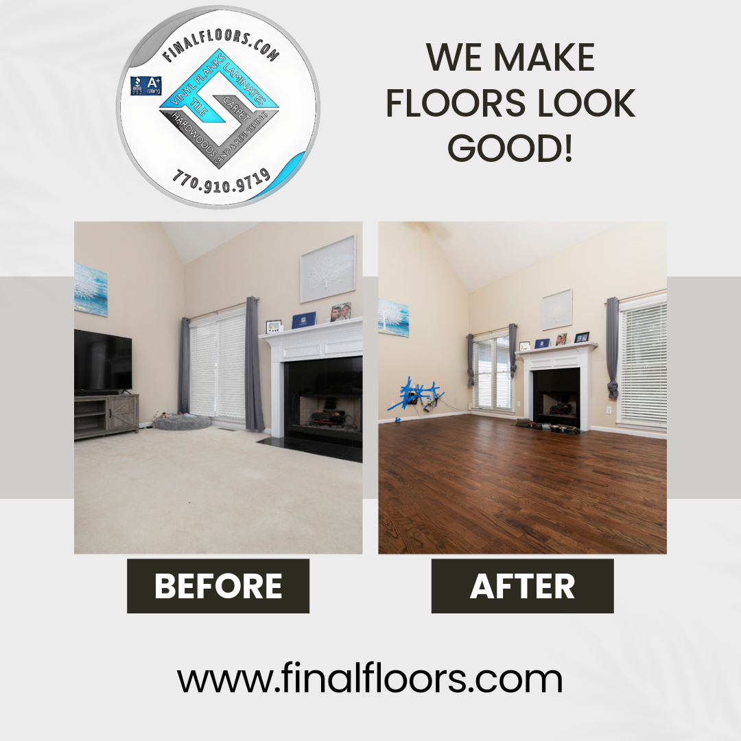 Ready to witness the incredible transformations we bring to homes and businesses in Metro Atlanta? At Final Floors LLC, we specialize in turning outdated, worn floors into stunning masterpieces. Whether it’s hardwood refinishing, vinyl plank installation, or carpet replacement, our expert team delivers results that speak for themselves.