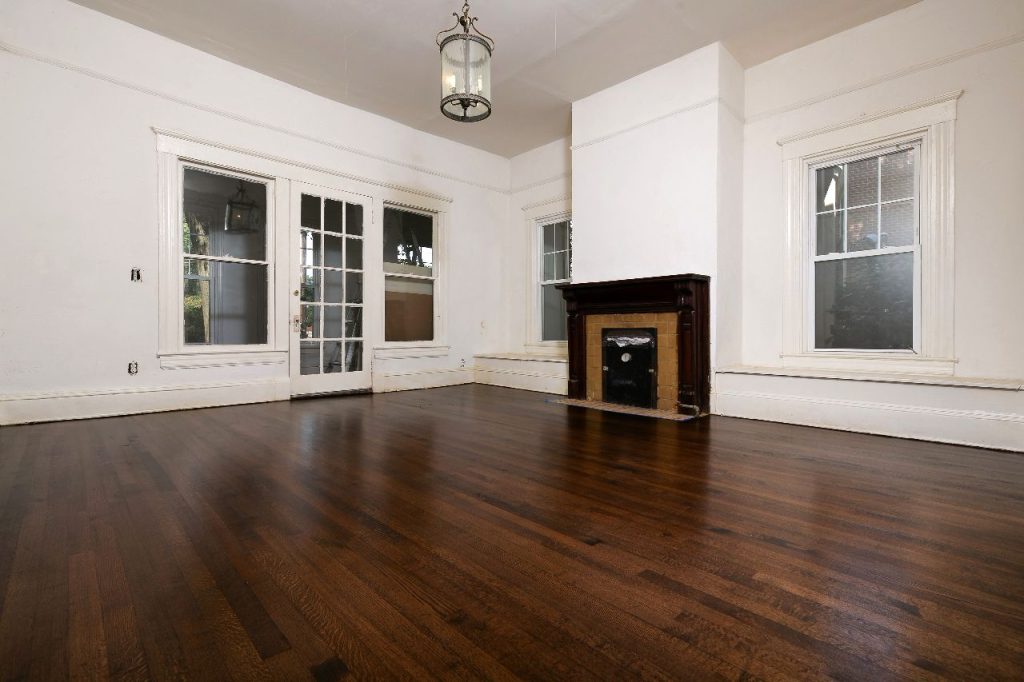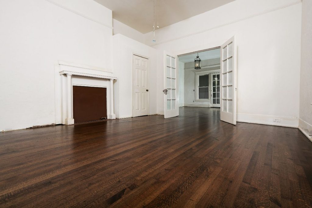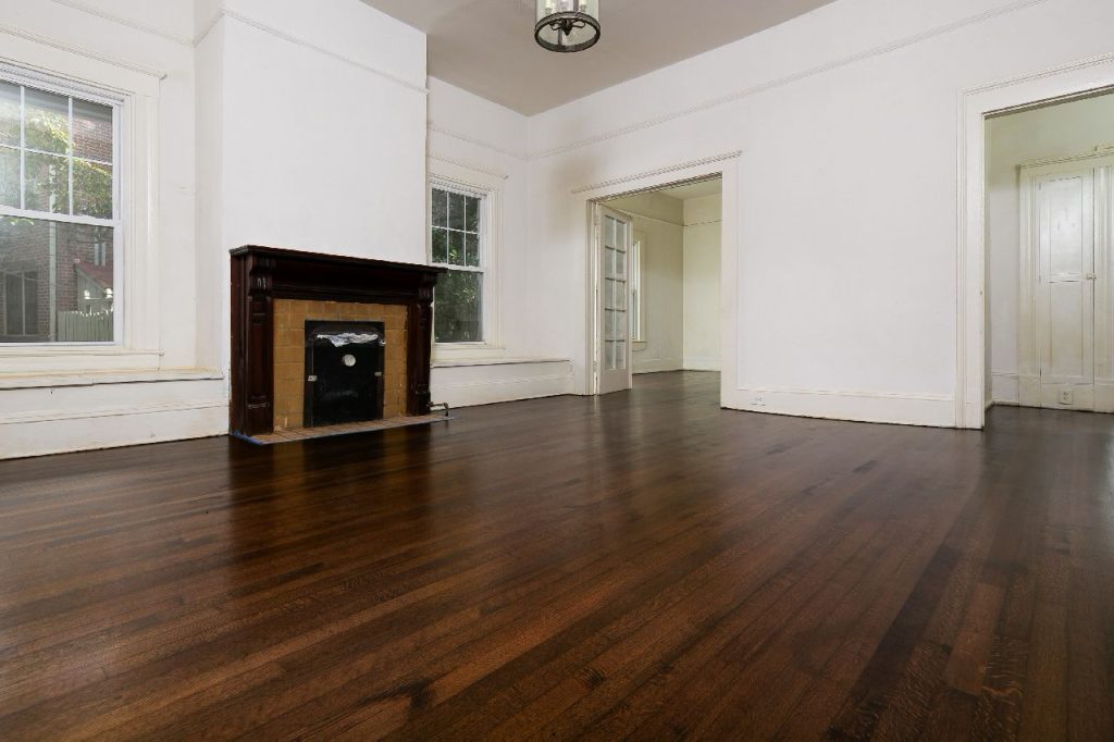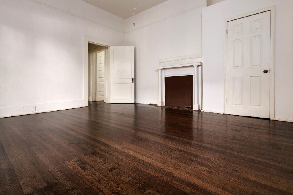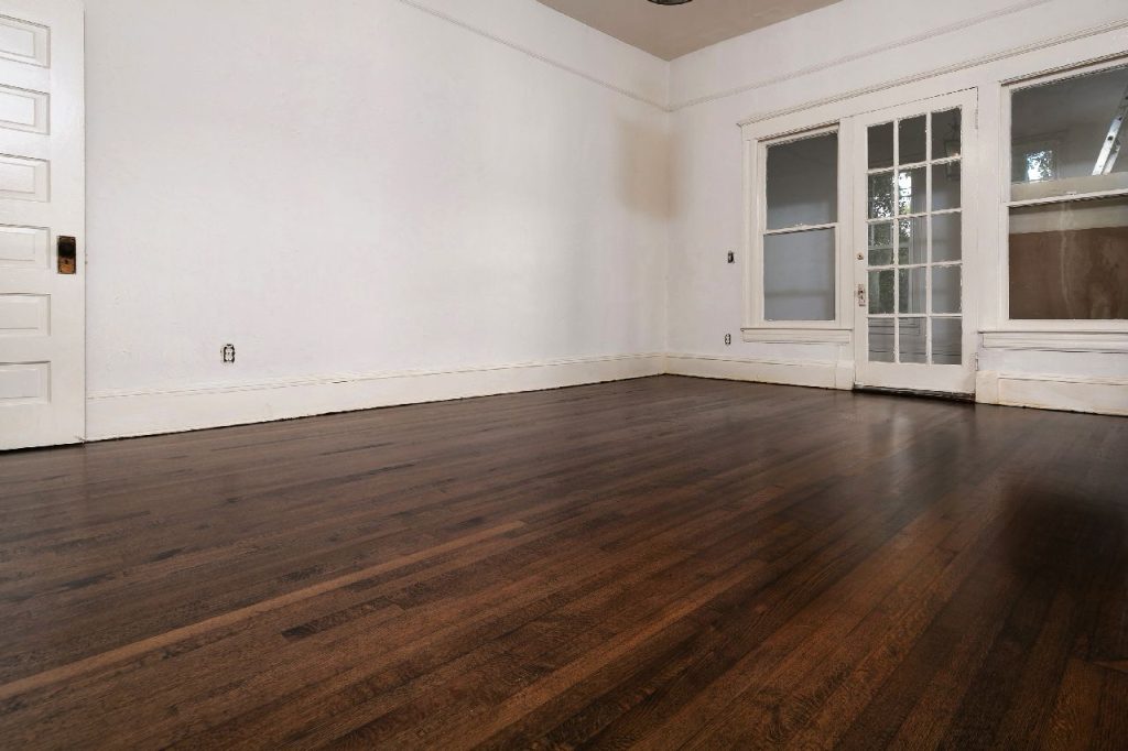 “After: The 135-year-old hardwood floor has been beautifully restored, showcasing its rich character and warmth. A true testament to the craftsmanship of Final Floors!”
