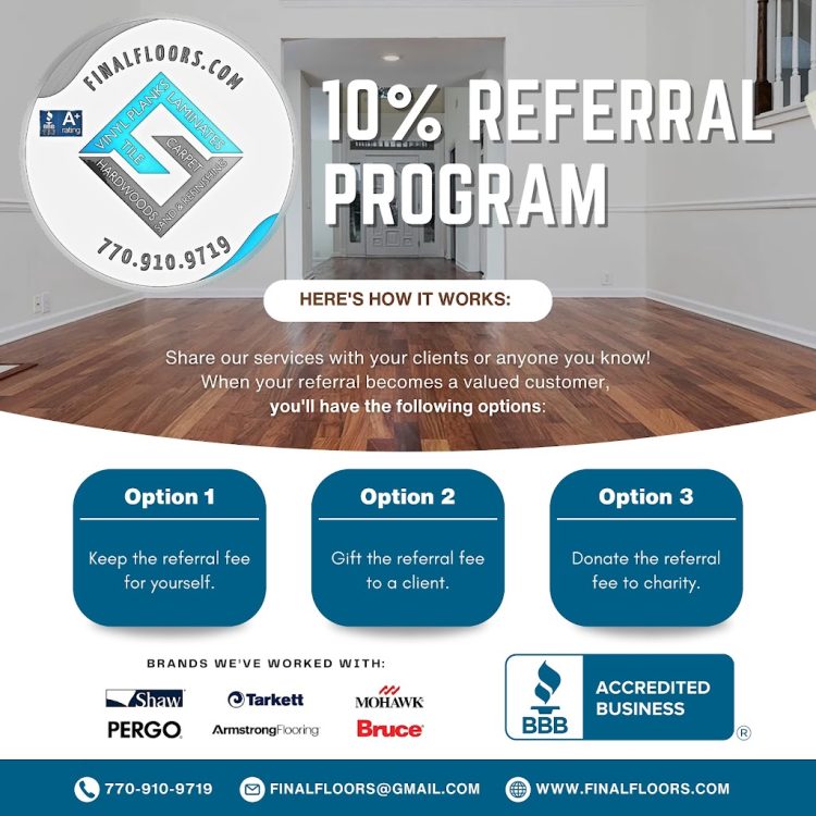 Hey everyone, I wanted to take a moment to remind you about our referral program at Final Floors! You can earn a 10% commission on any referral, give a 10% discount to friends, family, or clients, or even donate the 10% to a charity of your choice. It’s a great way to save or give back while helping others find top-quality!