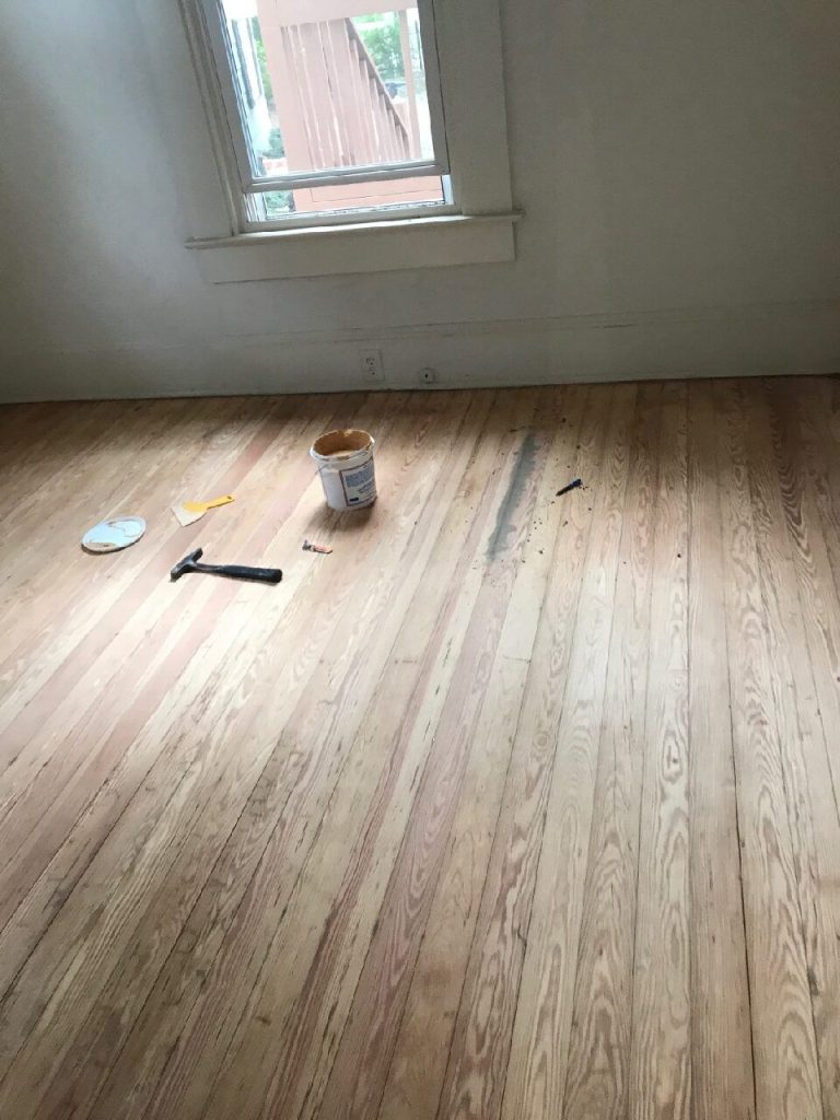 “Before: This 135-year-old hardwood floor shows signs of wear and age, but its potential for restoration is evident. Stay tuned to see the stunning transformation!”
