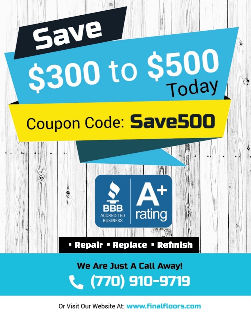 services include refinishing and water damage restoration. Contact us for a free estimate at 770-740-7985 or finalfloors@gmail.com. Visit our Google Business profile or Instagram @FinalFloorsATL for more!