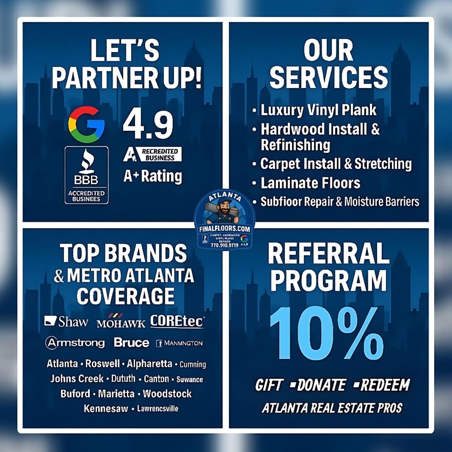 Final Floors LLC is Metro Atlantas trusted flooring company specializing in hardwood refinishing luxury vinyl plank installs carpet installs and stretching laminate flooring subfloor repair and moisture barrier protection With an A+ BBB Accreditation and 49⭐ Google reviews from 185+ verified clients we are trusted by homeowners realtors and property managers across Atlanta Roswell Alpharetta Johns Creek Milton Sandy Springs Buckhead Brookhaven East Cobb Marietta Woodstock Kennesaw Duluth Canton Suwanee Buford and Cumming Our licensed in house crews never subcontractors provide same week scheduling and 13 day timelines We proudly install Shaw Mohawk COREtec Mannington Armstrong and Bruce flooring Ask about our Referral Rewards Program earn 10 back when you refer new clients Call 770 910 9719 or visit FinalFloorscom today for your free written estimate We Make Floors Look Good